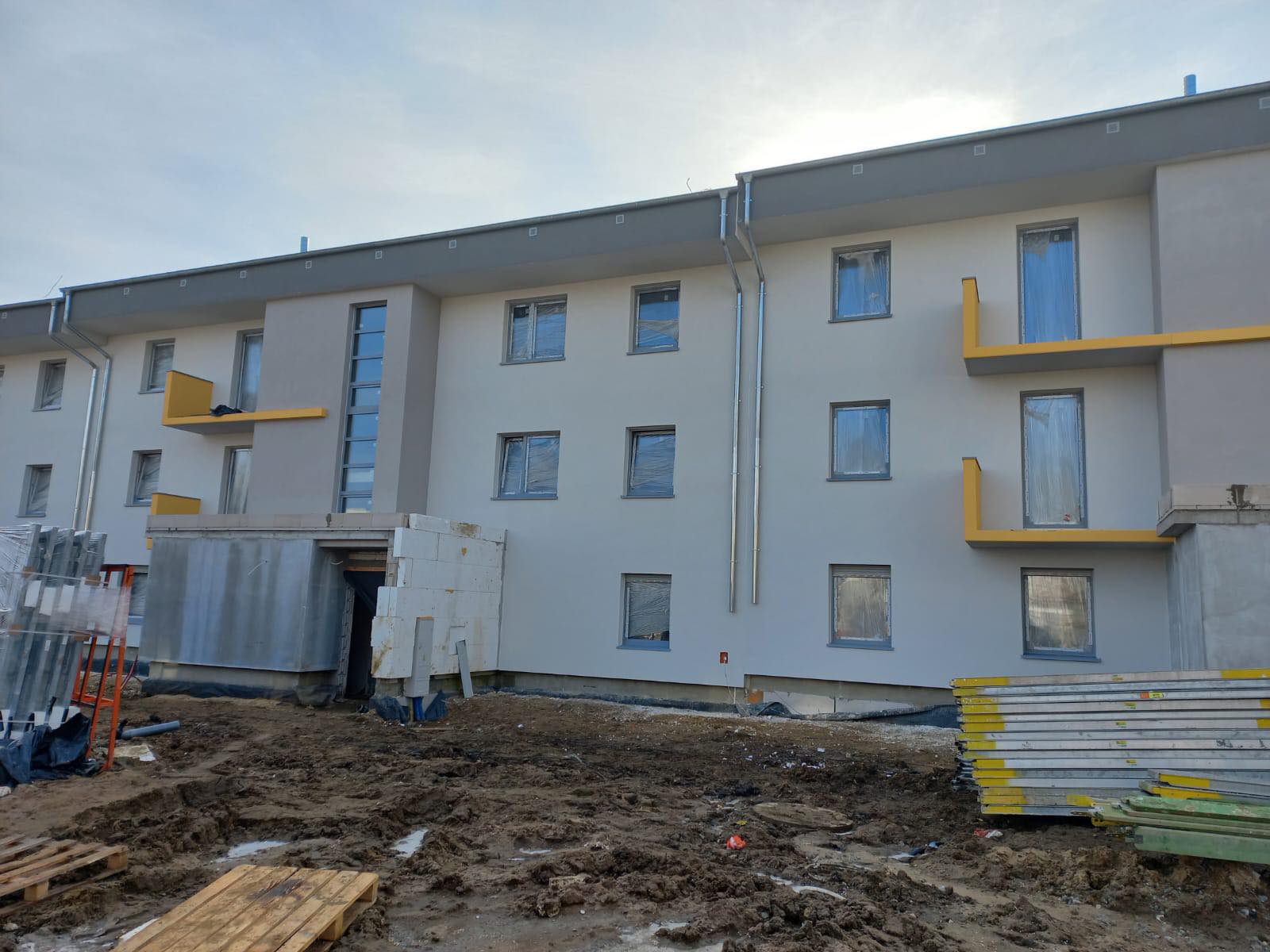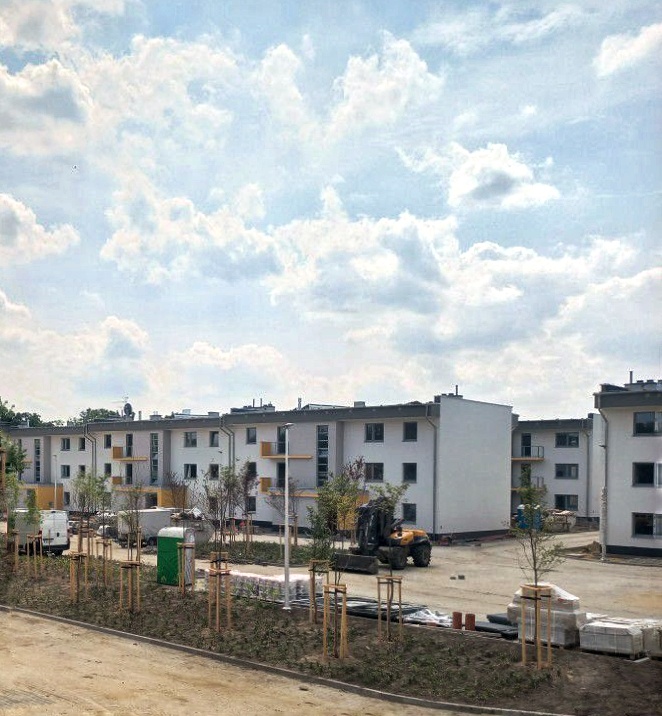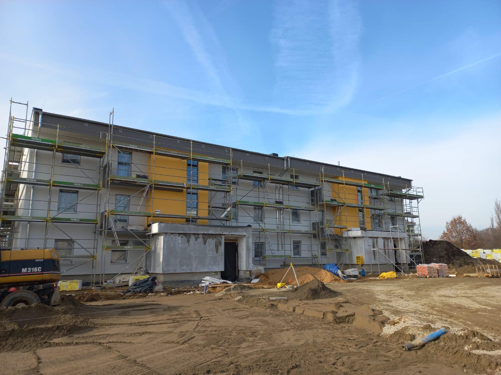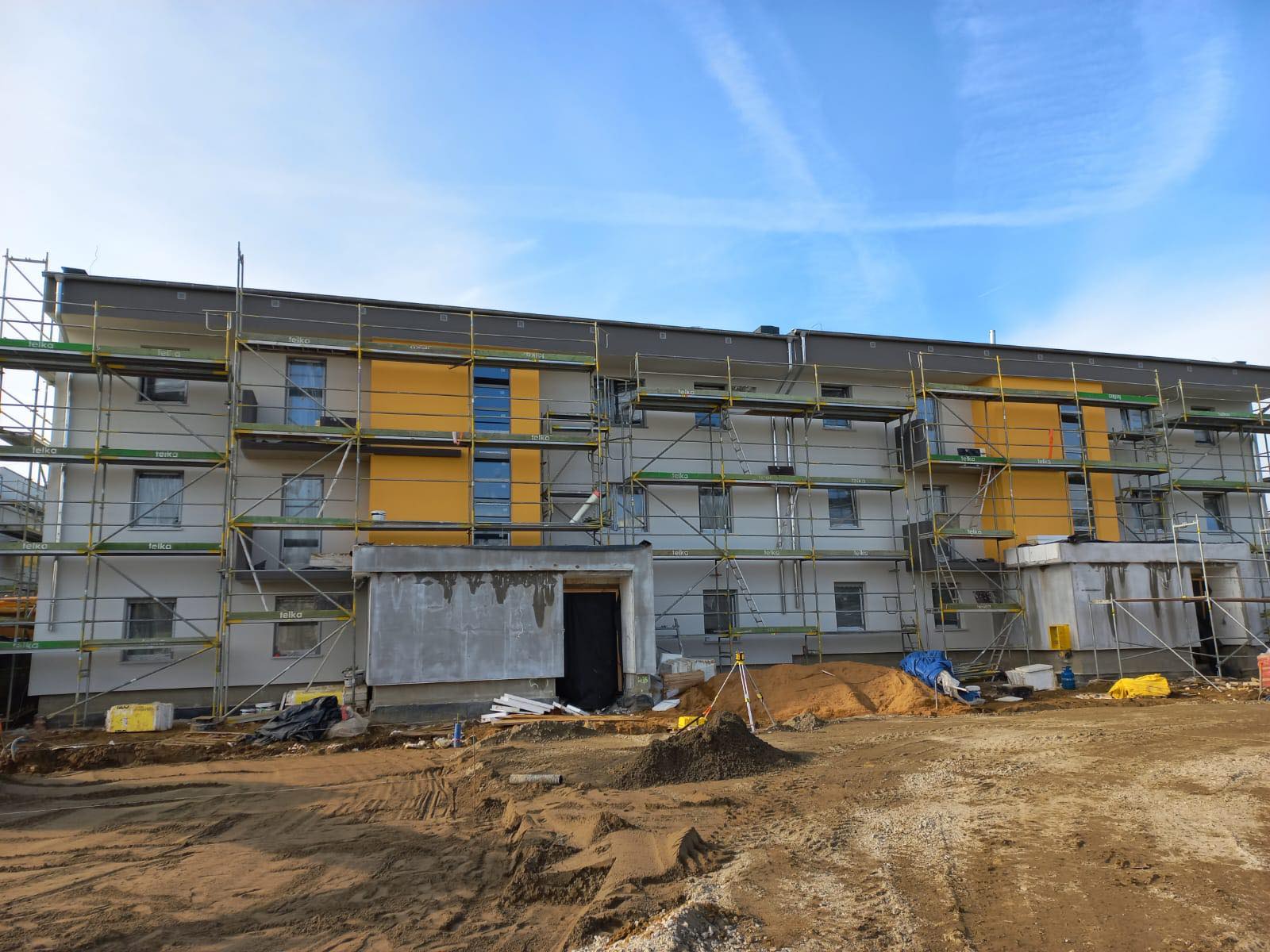 Wszystkie prace są wykonywane zgodnie z harmonogramem - budynki są w stanie surowym zamkniętym, a wykonawca zajmuje się teraz pracami wykończeniowymi oraz ociepleniem elewacji.