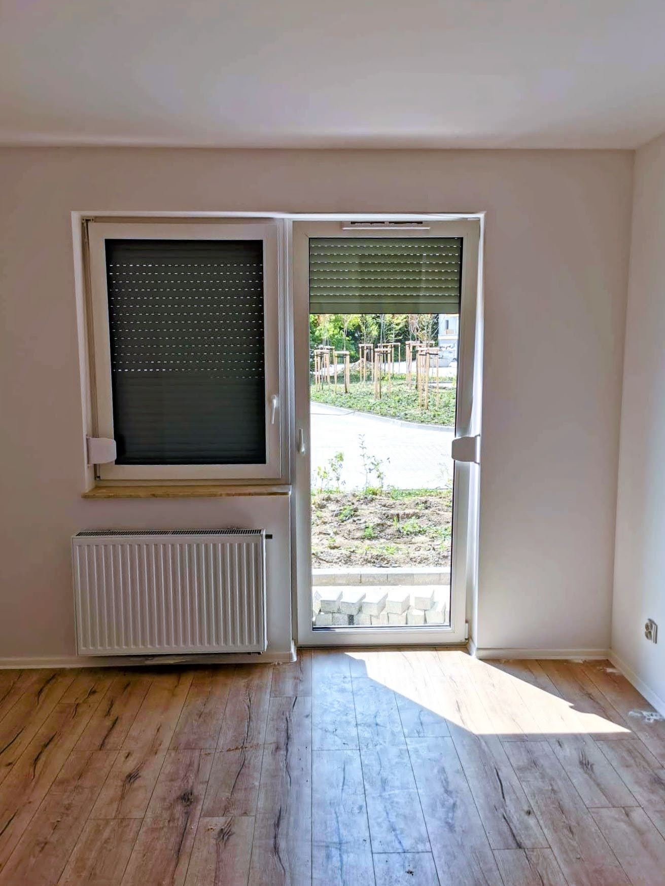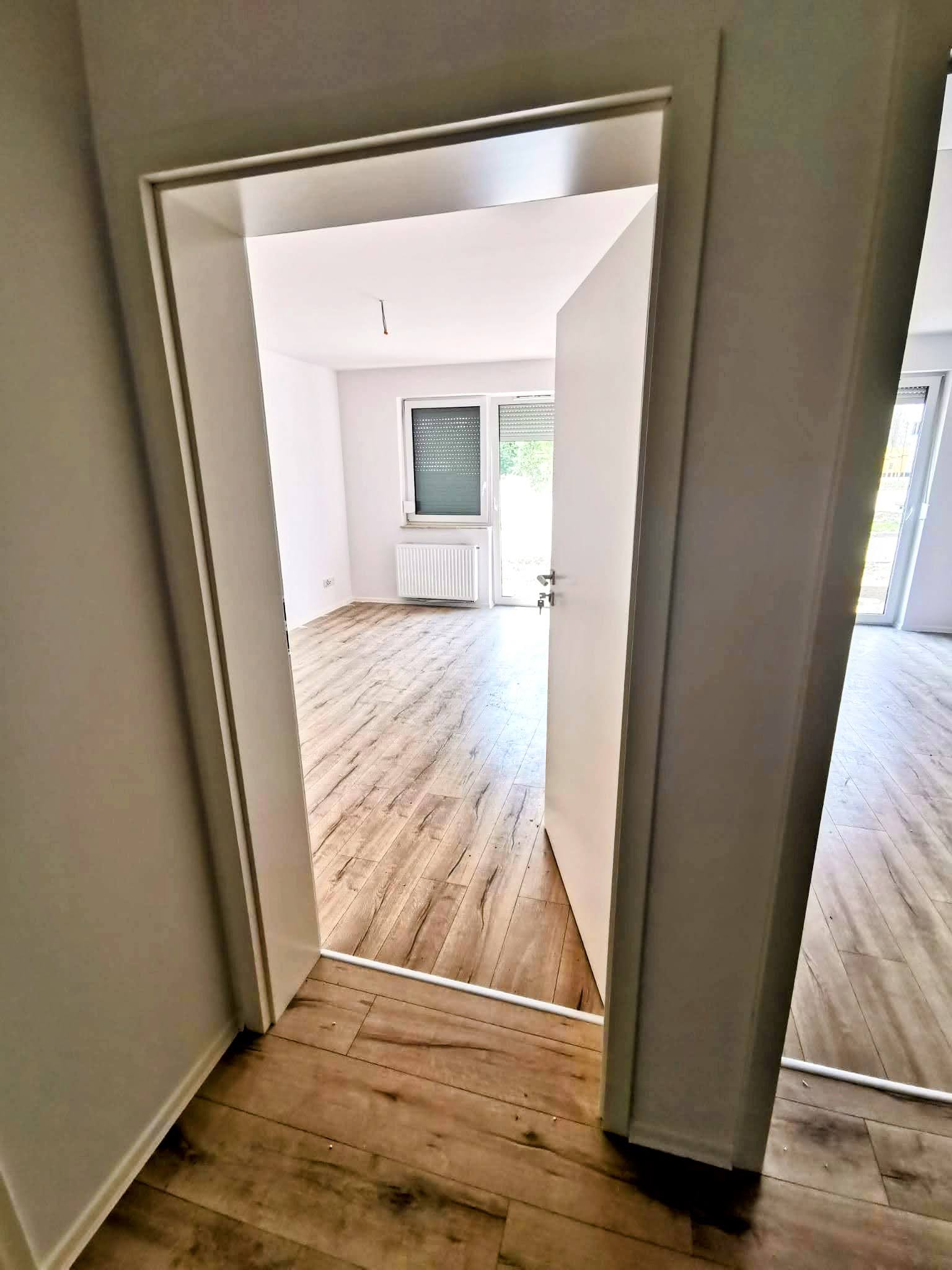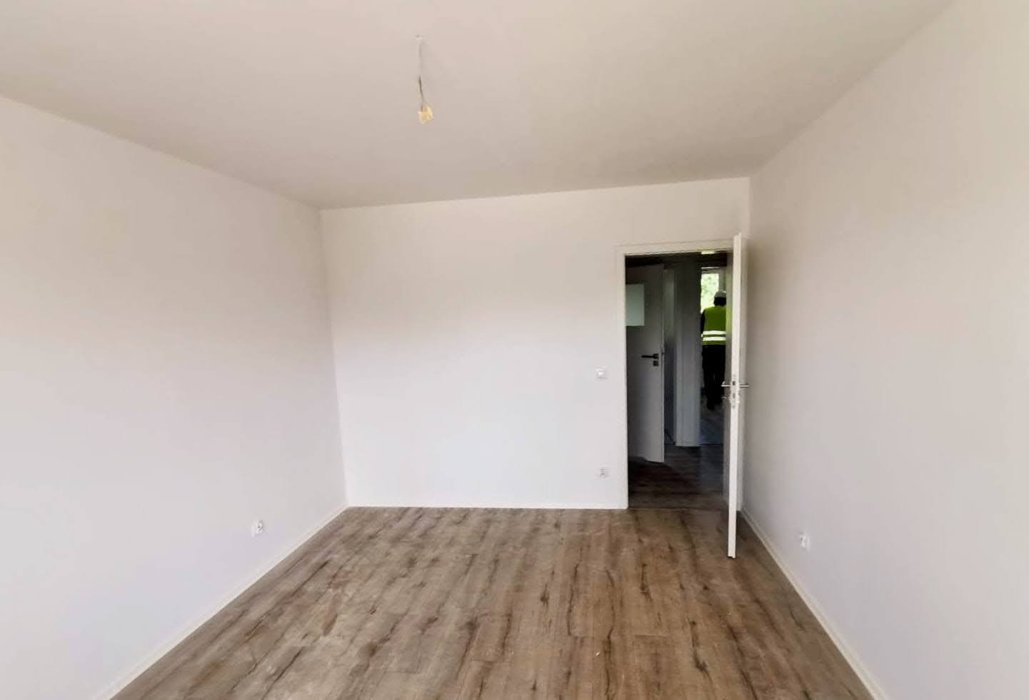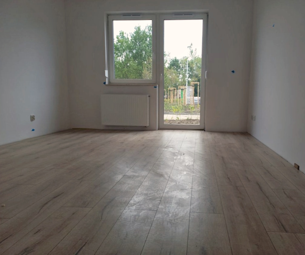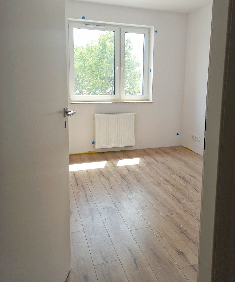 - trwają prace wykończeniowe wewnątrz mieszkań — w niektórych lokalach są już kładzione panele podłogowe, są też wstawiane drzwi,