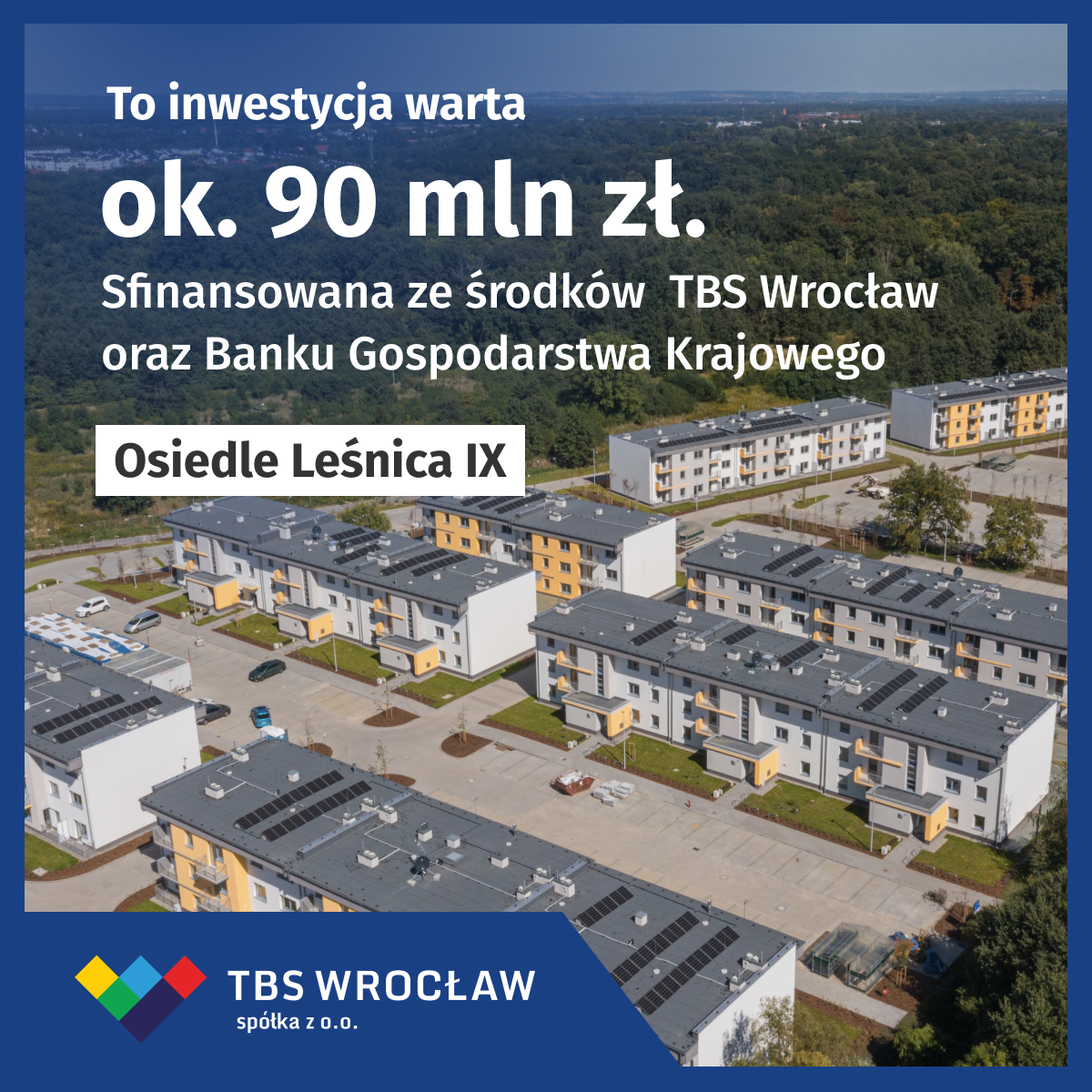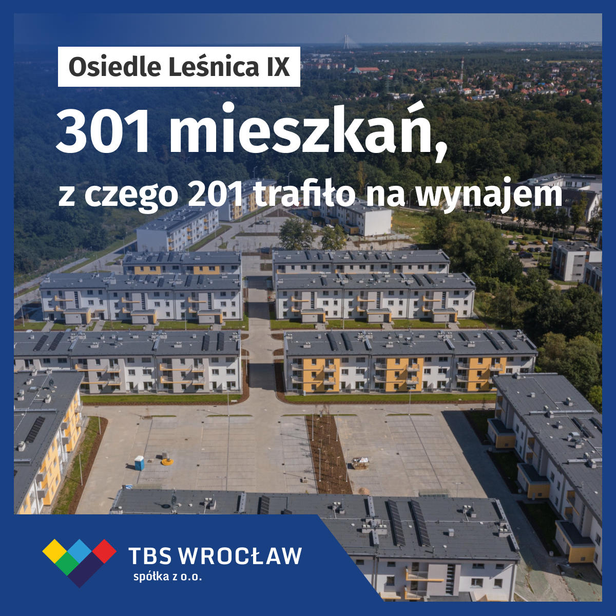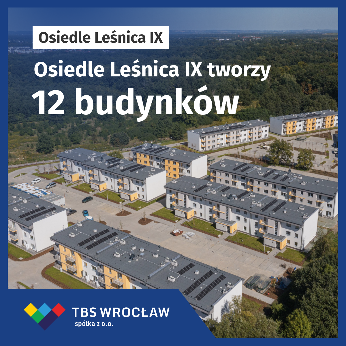 Budowa Leśnicy IX trwała blisko dwa lata: od grudnia 2021 r. do października 2023 r. To inwestycja warta blisko 90 mln zł, w ramach której powstało 12 budynków z 301 mieszkaniami oraz 10 lokalami usługowymi na wynajem. Każdy budynek ma własną instalację fotowoltaiczną, pod osiedlem powstał system retencji wód deszczowych, na dzieci czeka bezpieczny plac zabaw, a na kierowców — blisko 380 miejsc parkingowych. Wszystko to w malowniczej, zielonej scenerii pobliskiego Lasu Mokrzańskiego oraz parku Leśnickiego. Na samym osiedlu (a także, w ramach inwestycji, na sąsiednich osiedlach TBS Wrocław) nasadzono w sumie kilka tys. drzew i krzewów.