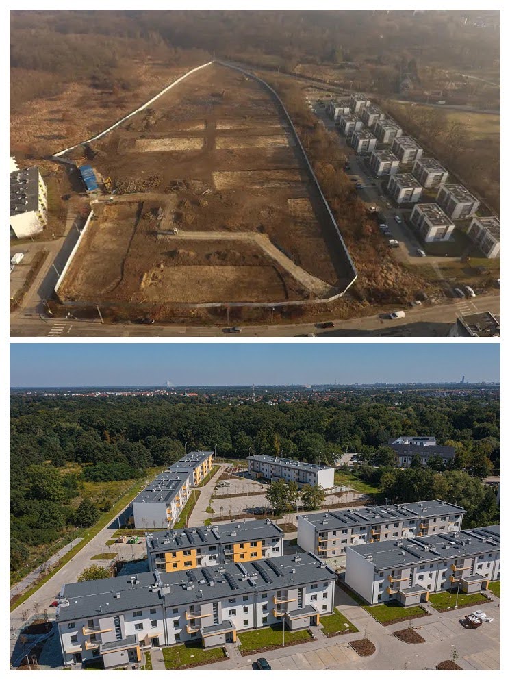 Osiedle Leśnica IX TBS Wrocław — zdjęcie tuż po rozpoczęciu budowy i po zakończeniu prac: